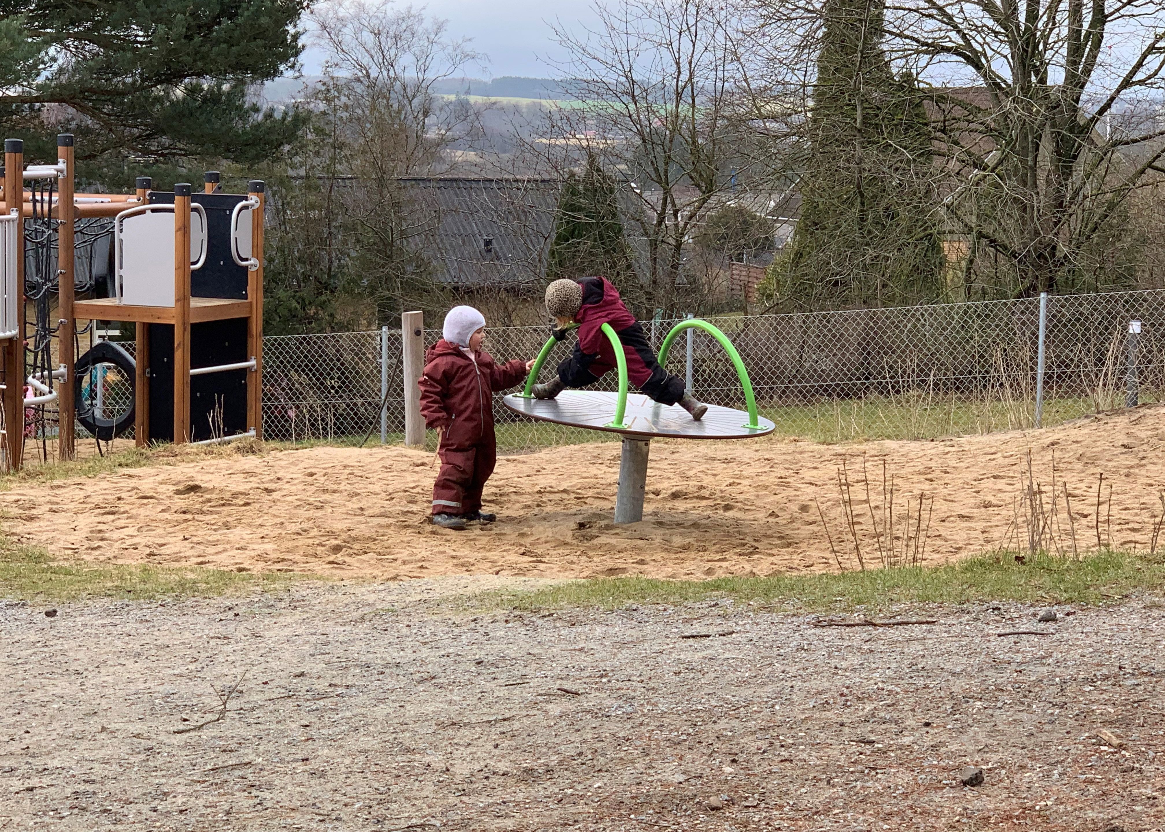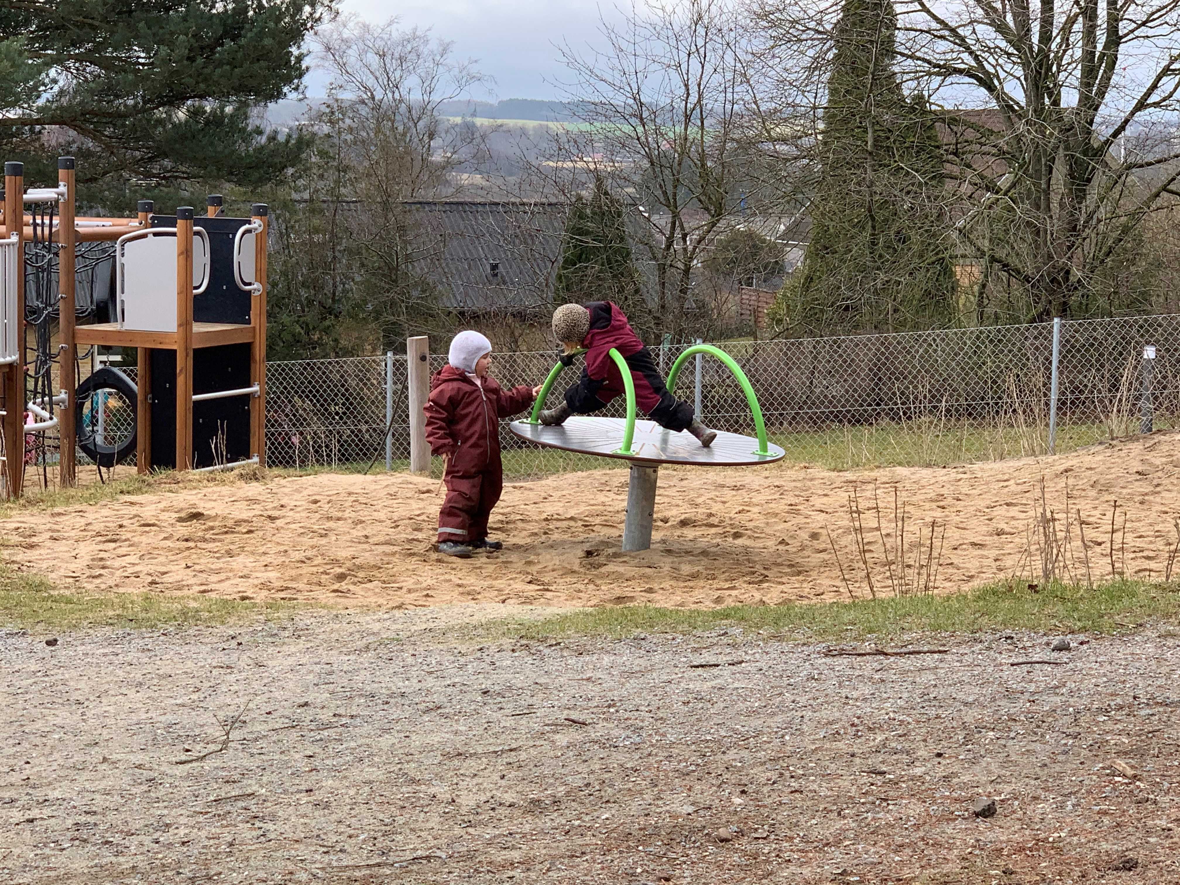 Vi spiser vores madpakker og hygger os omkring måltidet. Derefter går vi oftest på legepladsen, mens der er mulighed for en lur til de børn der har brug for det.